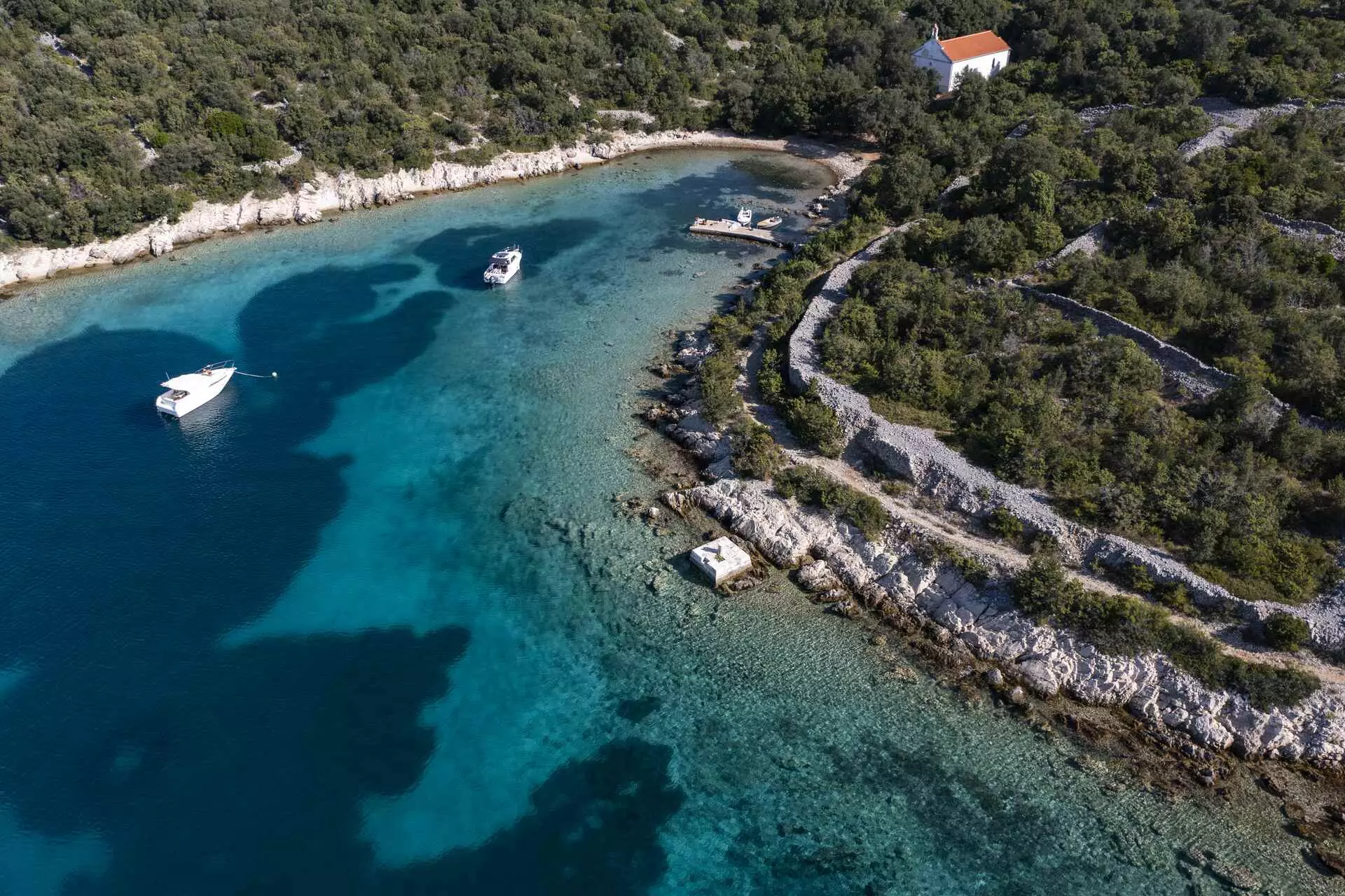 The lagoons on the south side of Olib operate by a different logic. These are smaller, deliberately, it seems, and all of them are sandy. For a yacht at anchor, the combination of size and bottom quality creates something unusually intimate: drop the hook in the right spot, and the lagoon becomes, for all practical purposes, your own private stretch of sea.