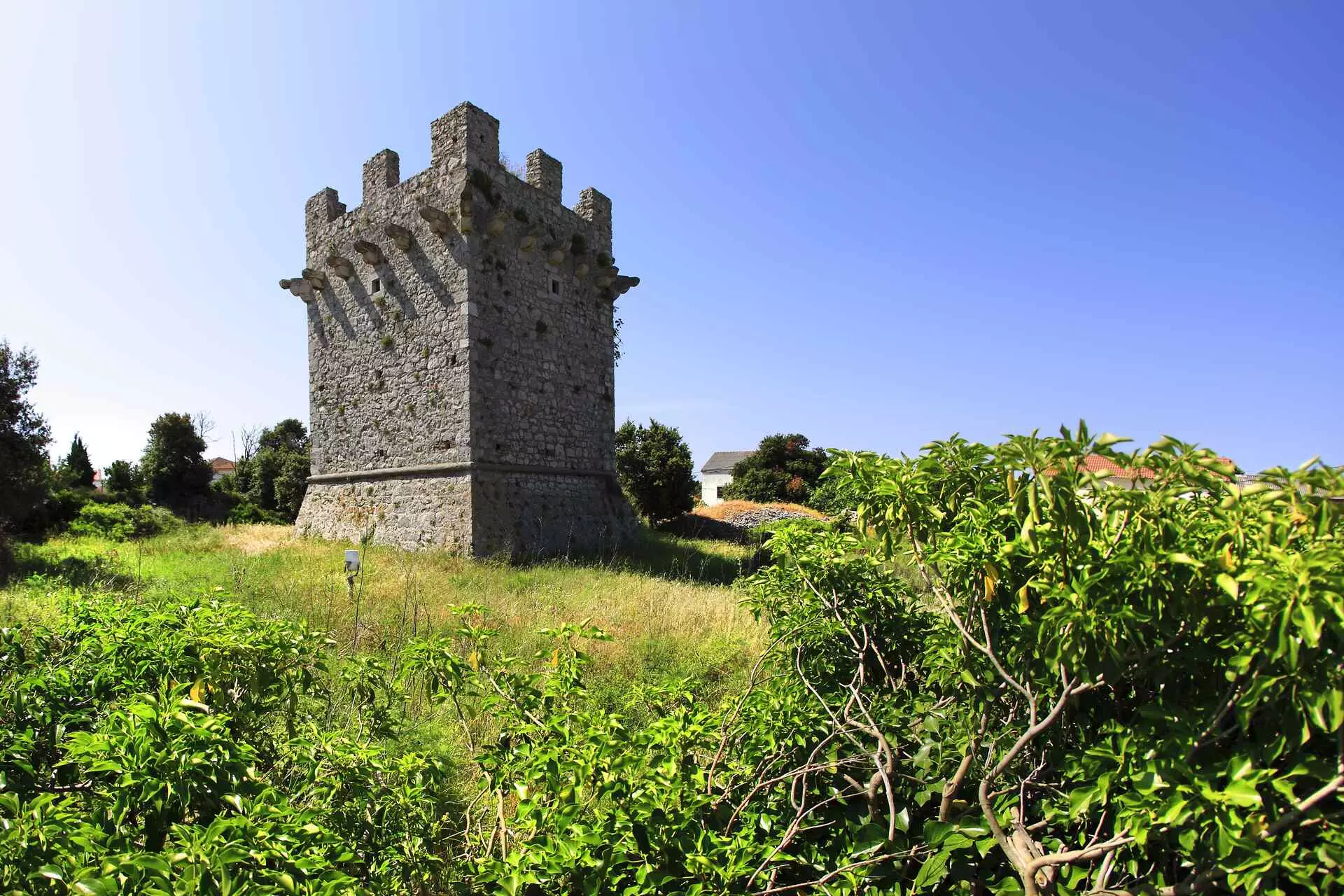 A wide road runs from the sparse cluster of houses on the north-west side of the island towards Gripanca Bay and the privately-owned castles, kaštela in Croatian.