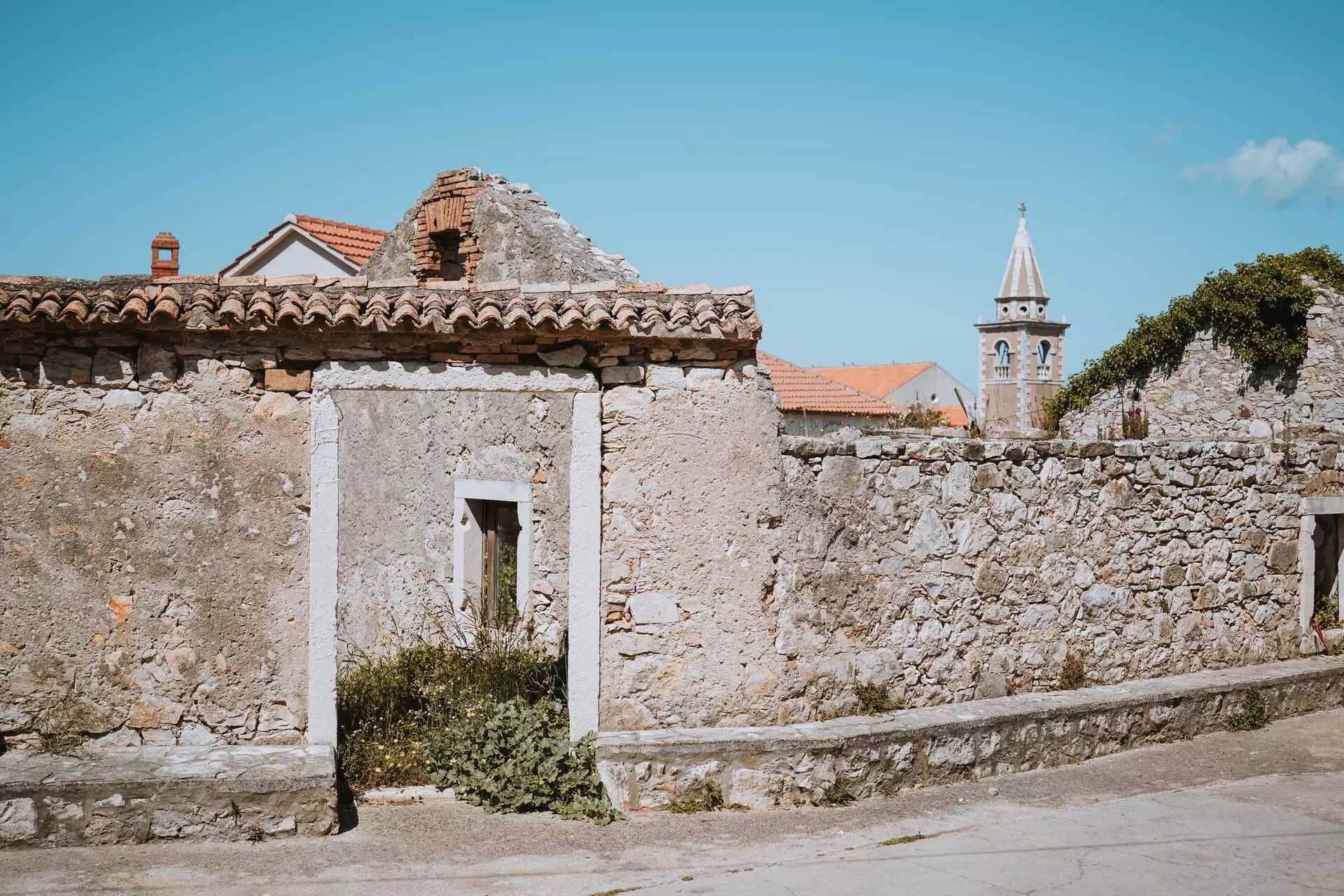 Directly across from Olib lies Škarda, a tiny island that tells a different kind of story. Only sixteen houses stand here, all of them abandoned, and yet abandoned is perhaps too clean a word. The families who left took nothing with them, or so it appears: photographs still hang on the walls, clothes remain in wardrobes, winter food supplies sit undisturbed. An entire domestic history is preserved inside these buildings, left abruptly and completely, as though the island's inhabitants simply walked out one day and never returned.