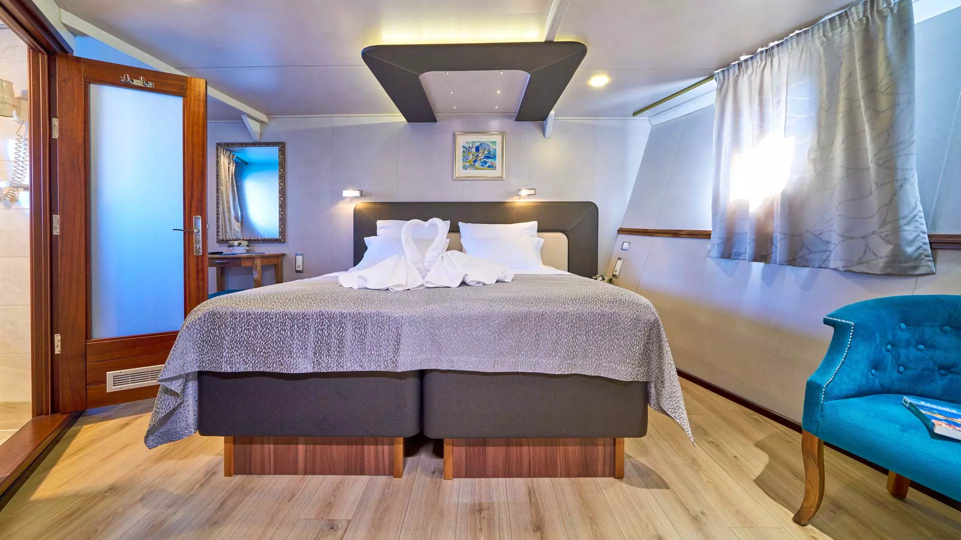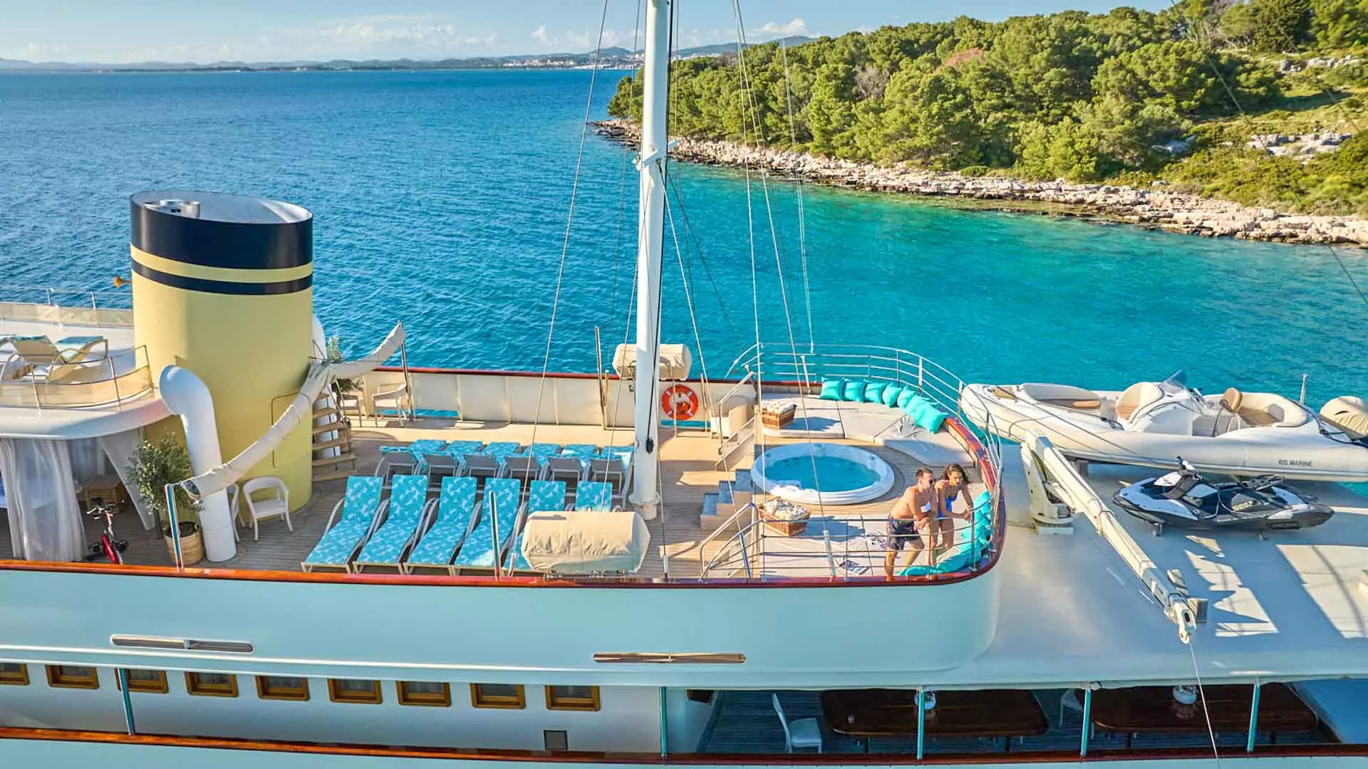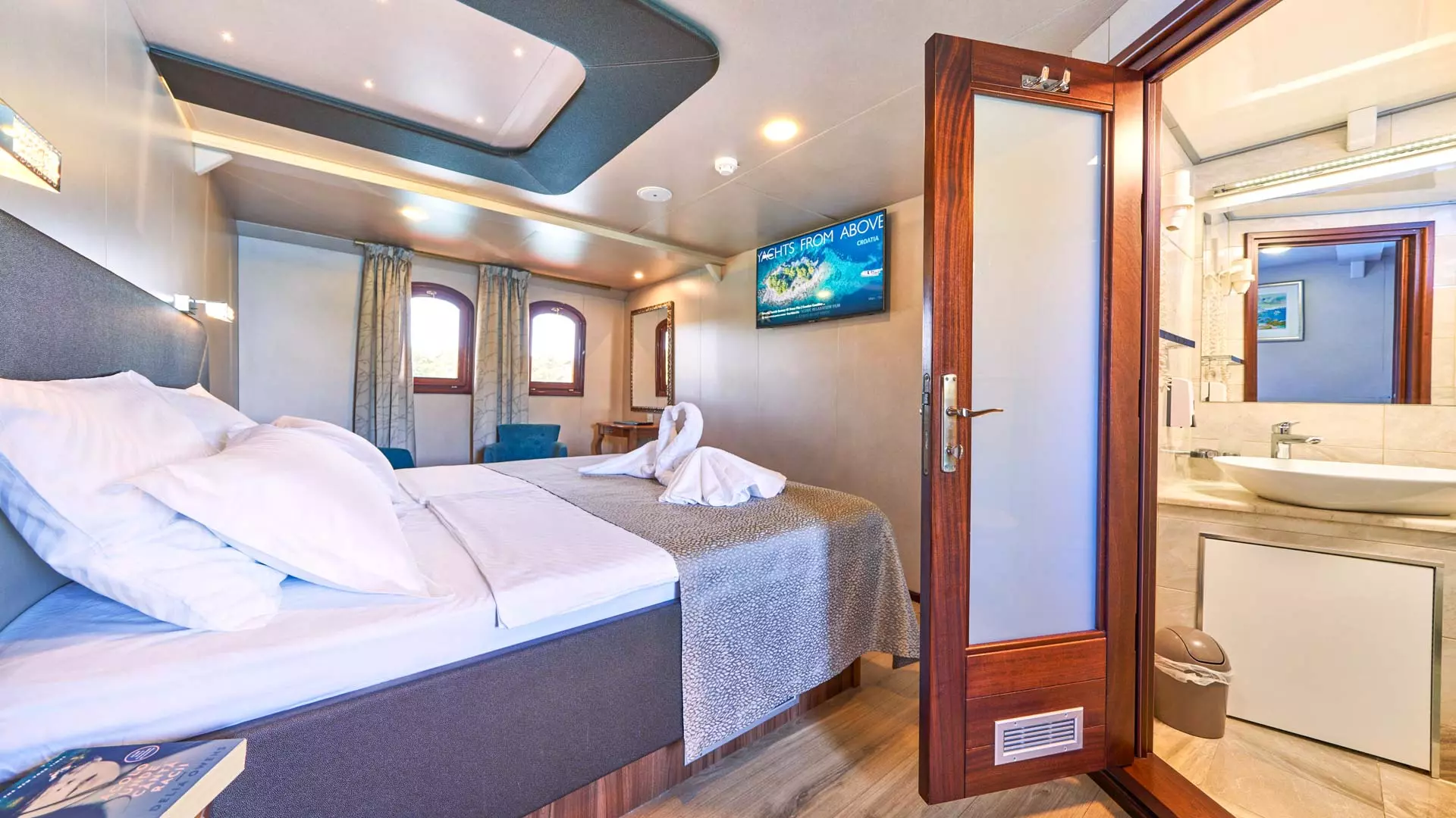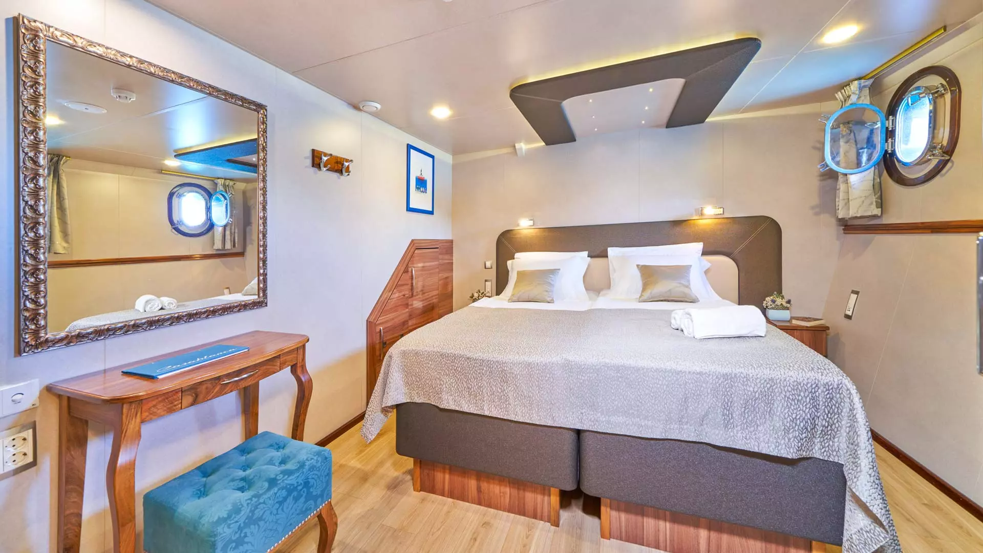 Luxury cruiser Casablanca, with length of 61meters, offers a seamless blend of elegance and comfort for an unforgettable cruising experience. Casablanca offers exceptional accommodation with 18 elegantly designed cabins, providing space for up to 36 guests in comfort and style. The main deck features a sophisticated salon restaurant with seating for all guests, a piano lounge, and a stylish bar for relaxation. Enhancing the onboard experience, the wellness zone includes a saltwater plunge pool, sauna, and massage room, ideal for rejuvenation. Guests can enjoy the stunning views from the expansive sun deck, complete with a Jacuzzi, sundeck area, and panoramic lounge. Casablanca combines luxurious amenities with impeccable service for an unforgettable cruising experience.