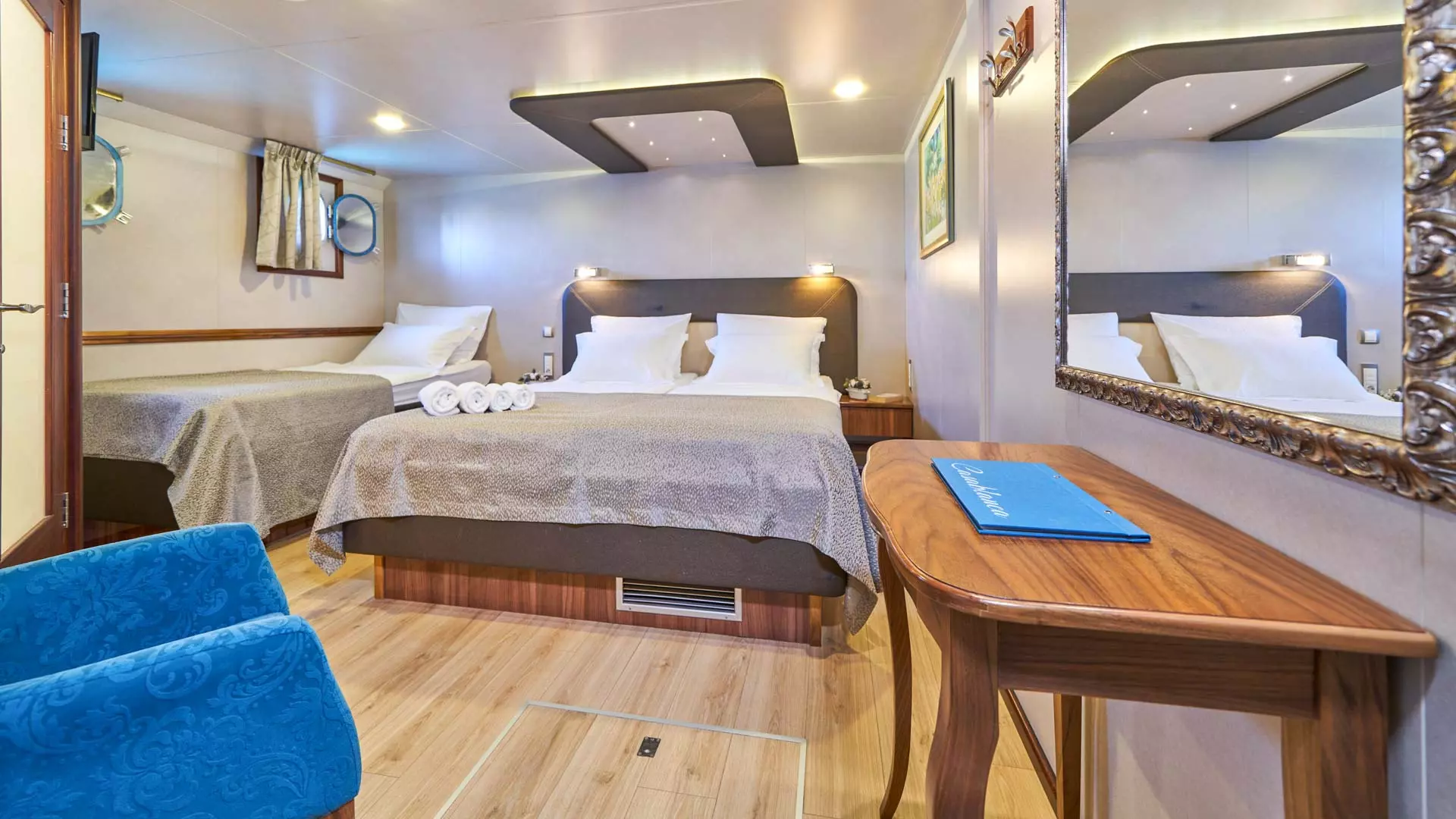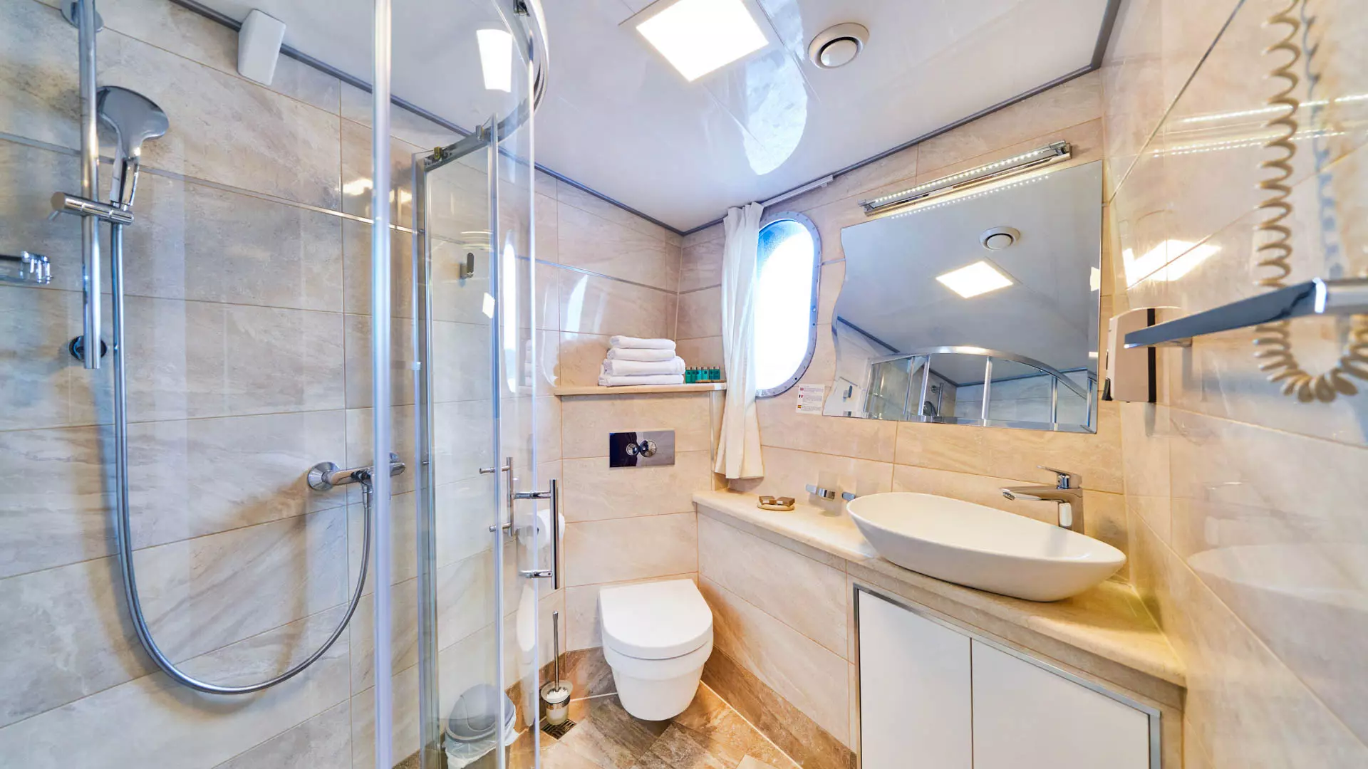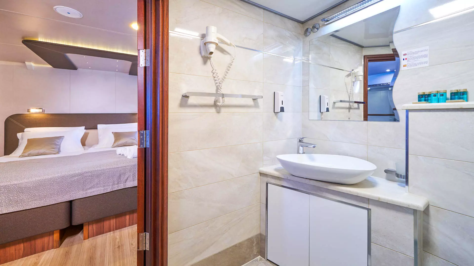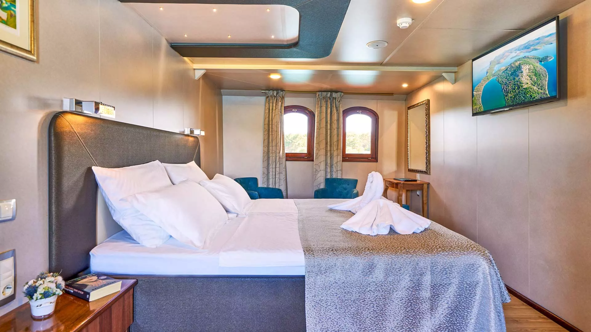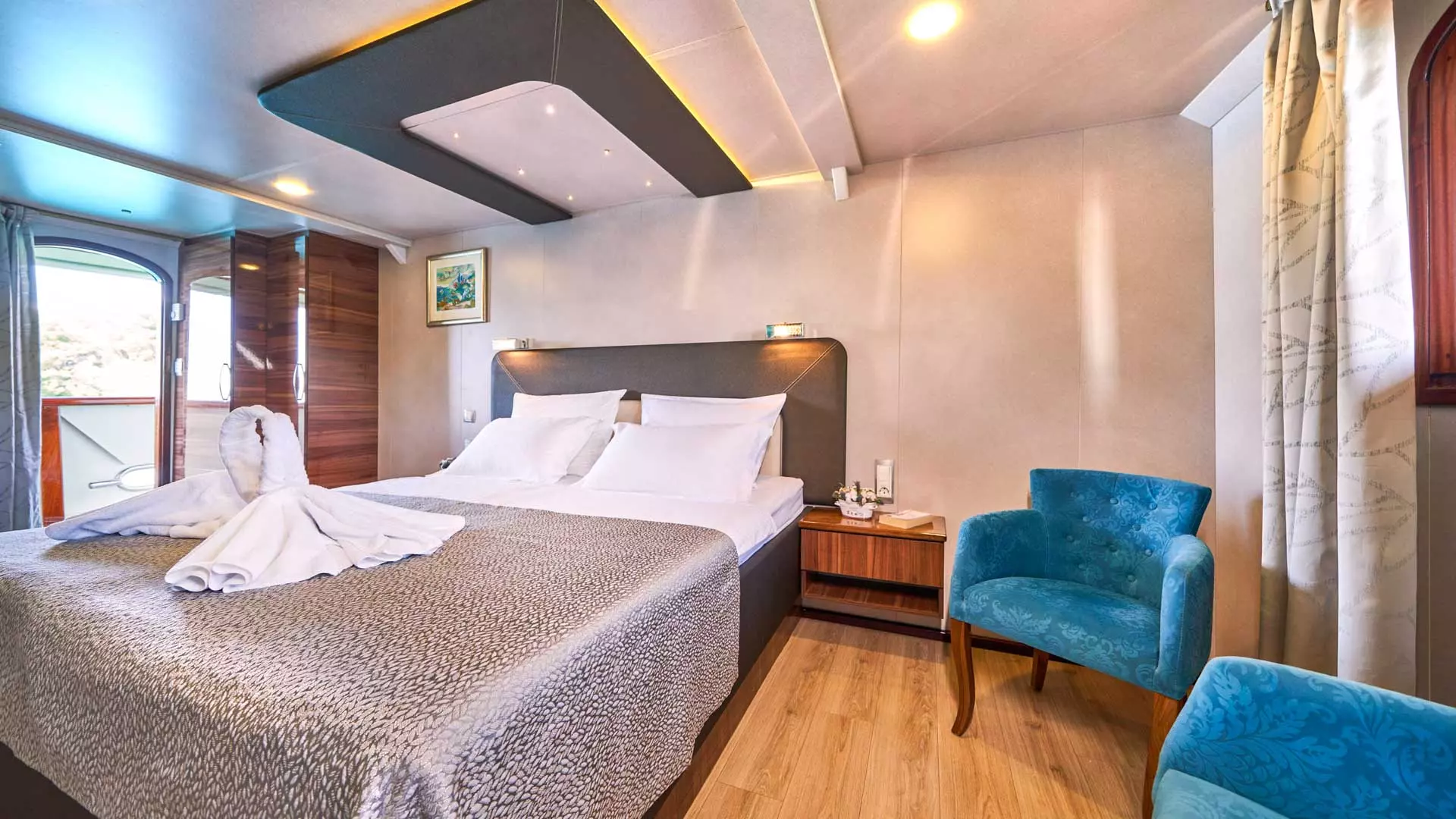 Luxury cruiser Casablanca, with length of 61meters, offers a seamless blend of elegance and comfort for an unforgettable cruising experience. Casablanca offers exceptional accommodation with 18 elegantly designed cabins, providing space for up to 36 guests in comfort and style. The main deck features a sophisticated salon restaurant with seating for all guests, a piano lounge, and a stylish bar for relaxation. Enhancing the onboard experience, the wellness zone includes a saltwater plunge pool, sauna, and massage room, ideal for rejuvenation. Guests can enjoy the stunning views from the expansive sun deck, complete with a Jacuzzi, sundeck area, and panoramic lounge. Casablanca combines luxurious amenities with impeccable service for an unforgettable cruising experience.