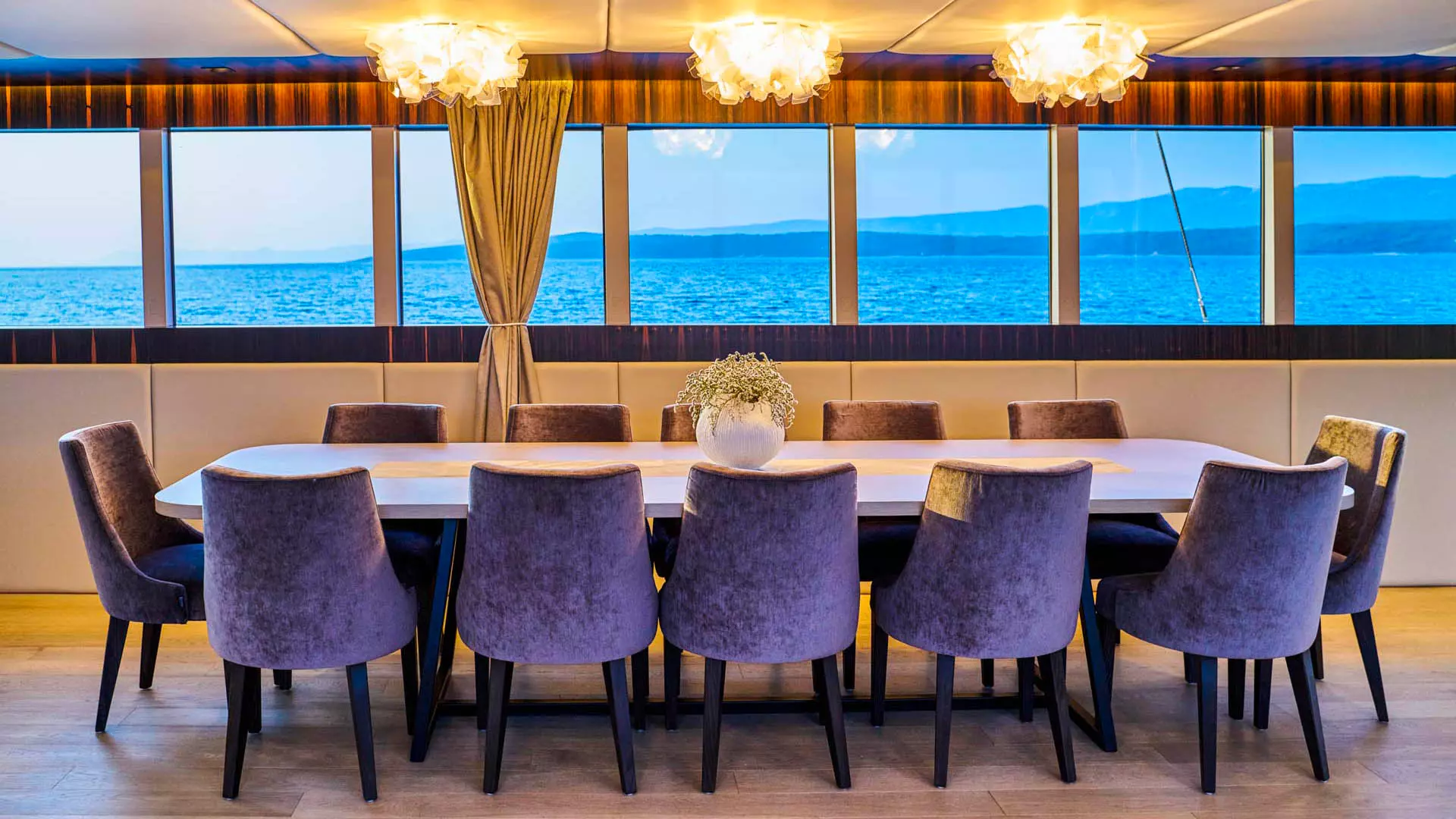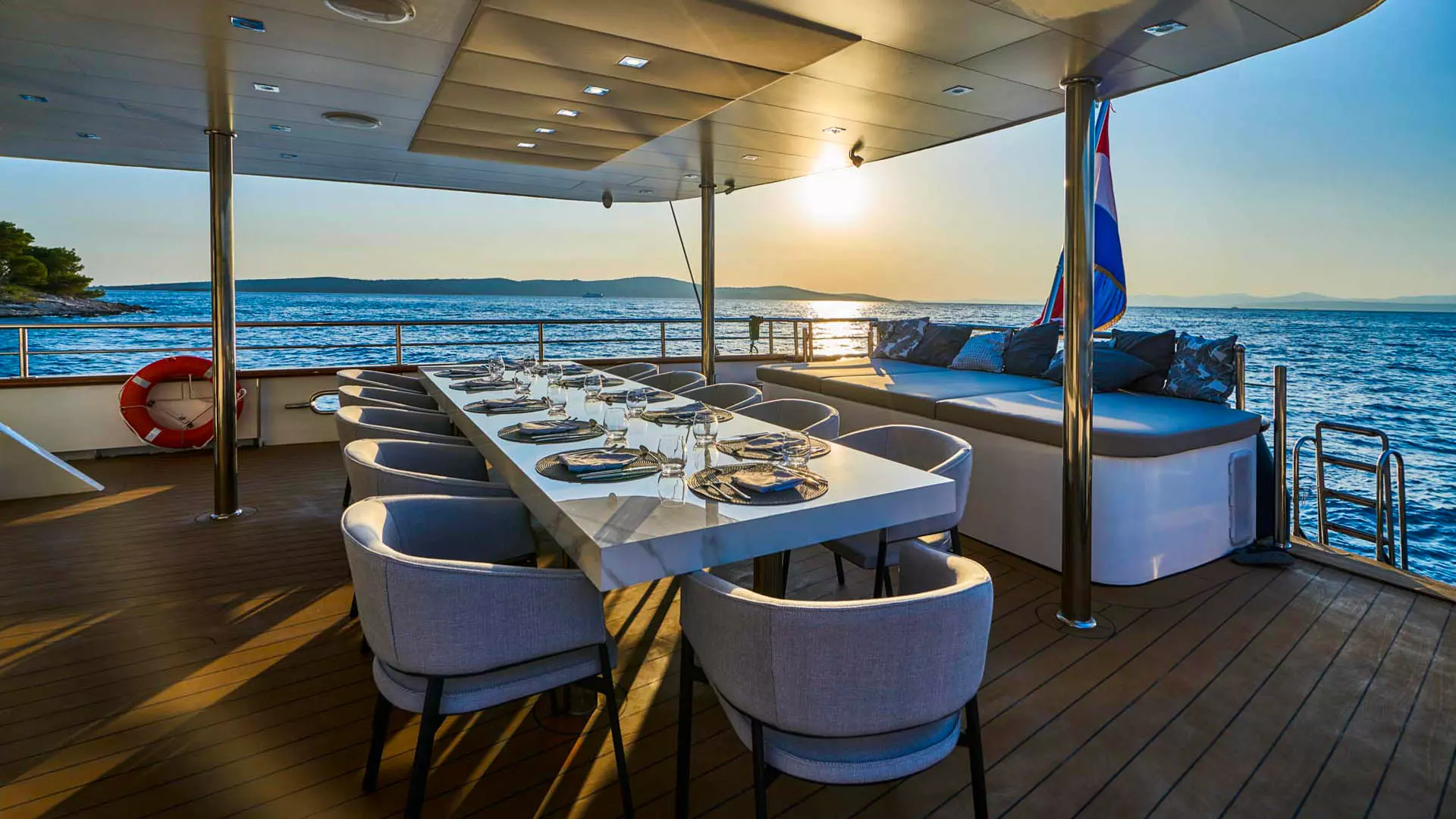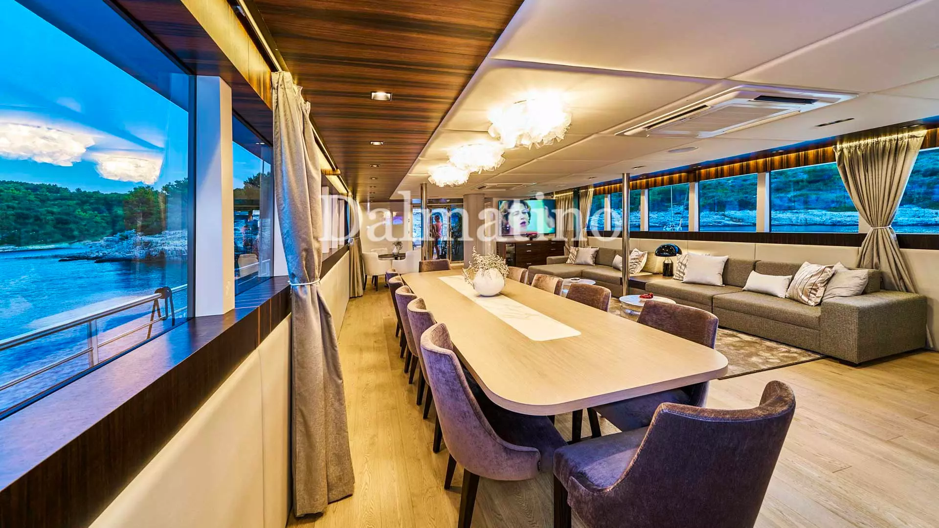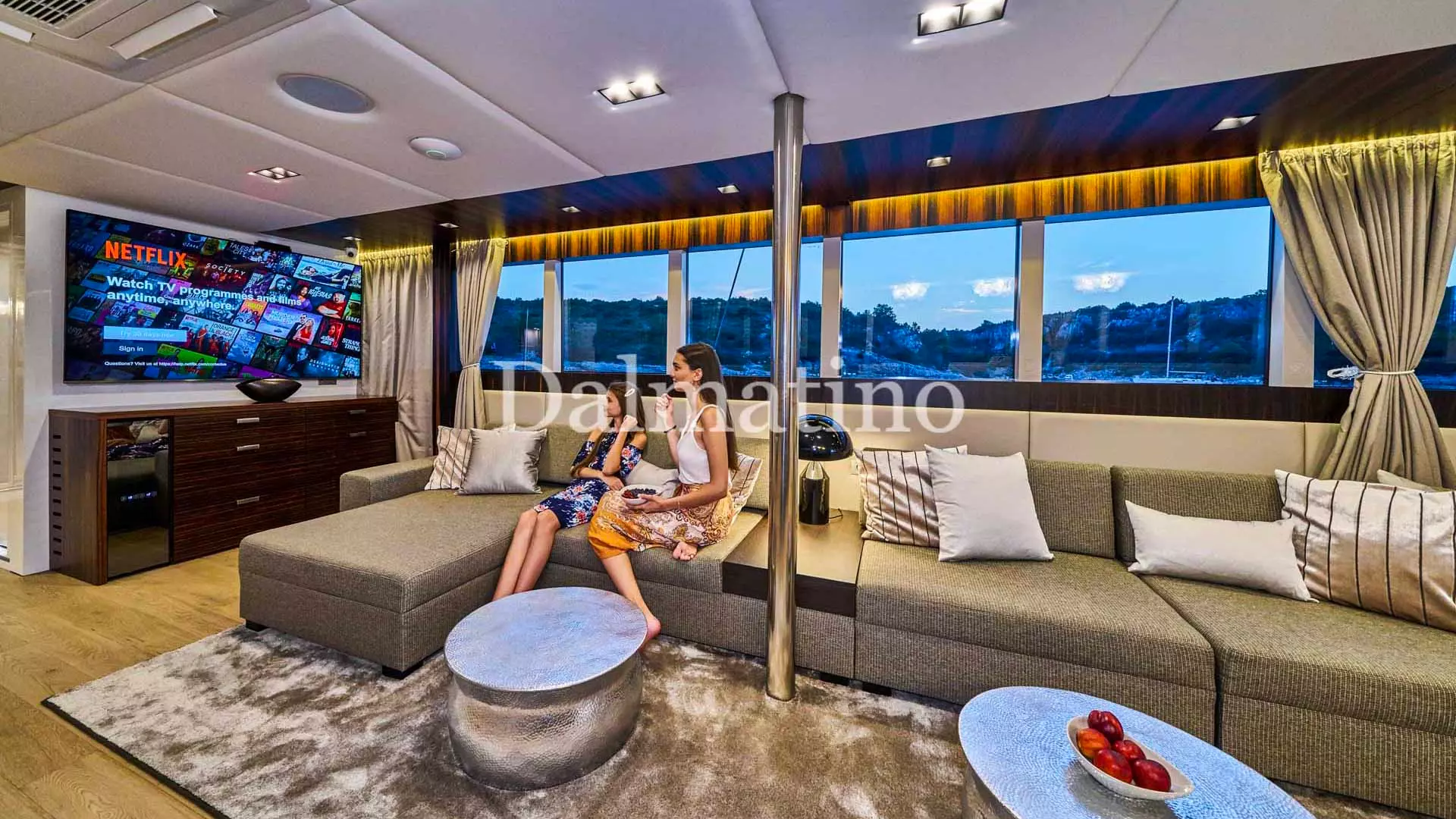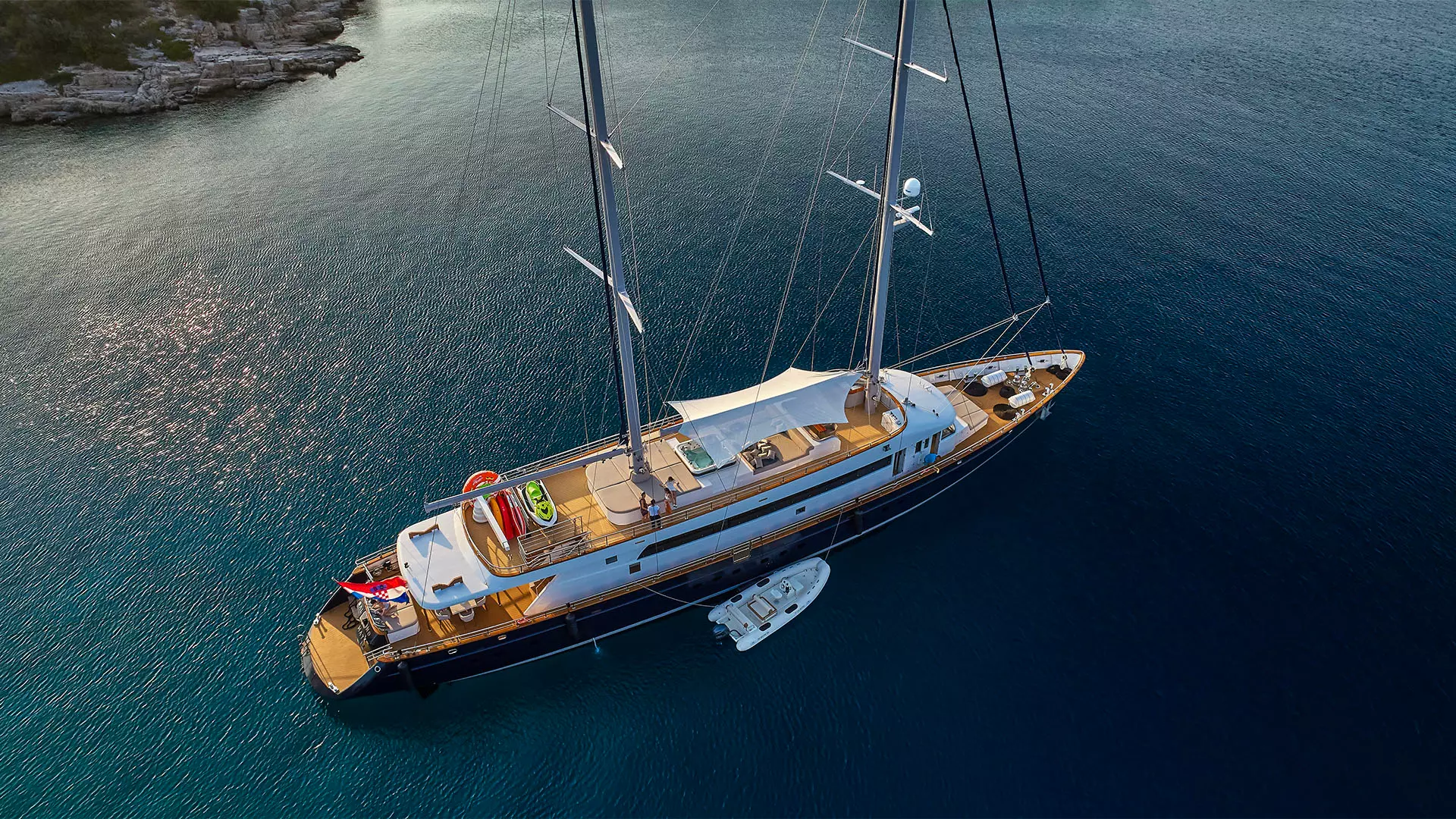The luxury sailing yacht Dalmatino perfectly combines modern luxury and traditional characteristics. As a matter of fact, this impressive blue-hulled yacht will ensure unforgettable cruising moments for up to 12 guests. Certainly, a professional and attentive crew will give the royal flavor to your Adriatic sailing experience on the yacht Dalmatino.