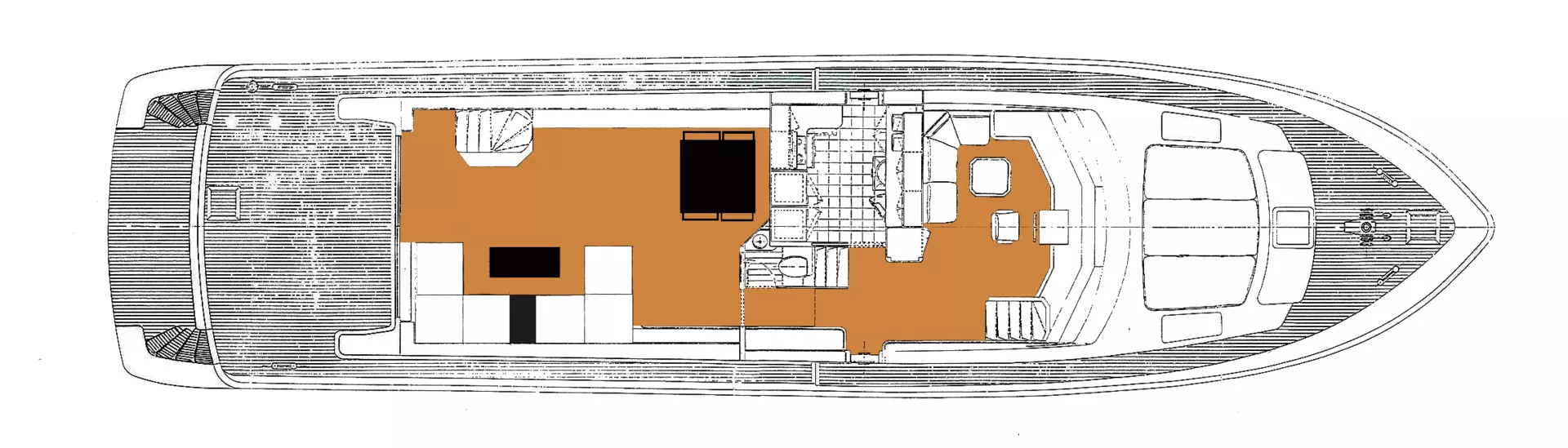 Large flybridge with lounge and sundeck area, spacious front sunbathing area and stern cockpit