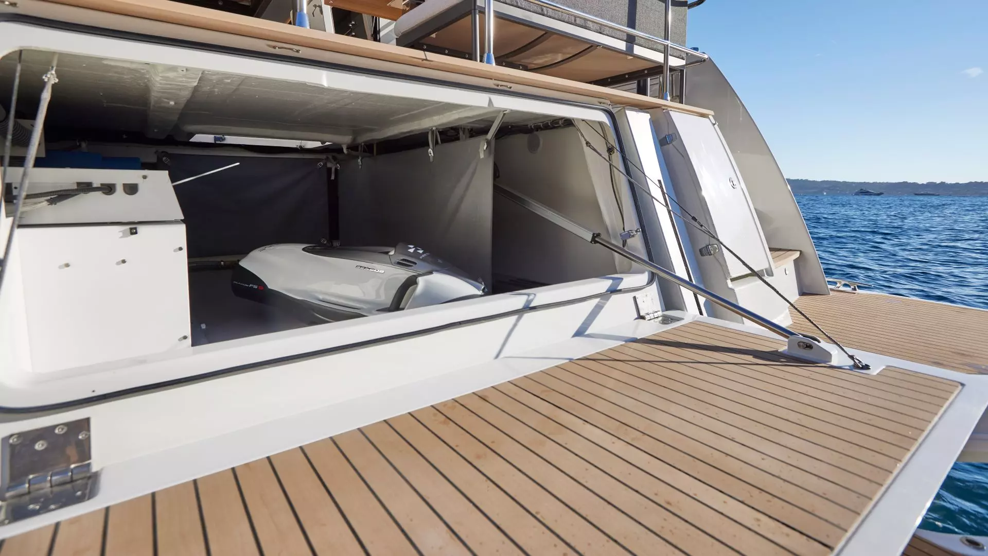 Well-rounded design gives this model a flowing, harmonious appearance, making sure it doesn’t appear too tall in relation to its length. Above the moving aft platform, which can be raised almost to the level of the main deck or lowered underwater, the long telescopic gangway leads directly to the aft part of the deck, covered and well protected from the wind, offering comfortable guest accommodation on two moving L-shaped sofas with folding tables and creating a perfect place for dining in the shade.