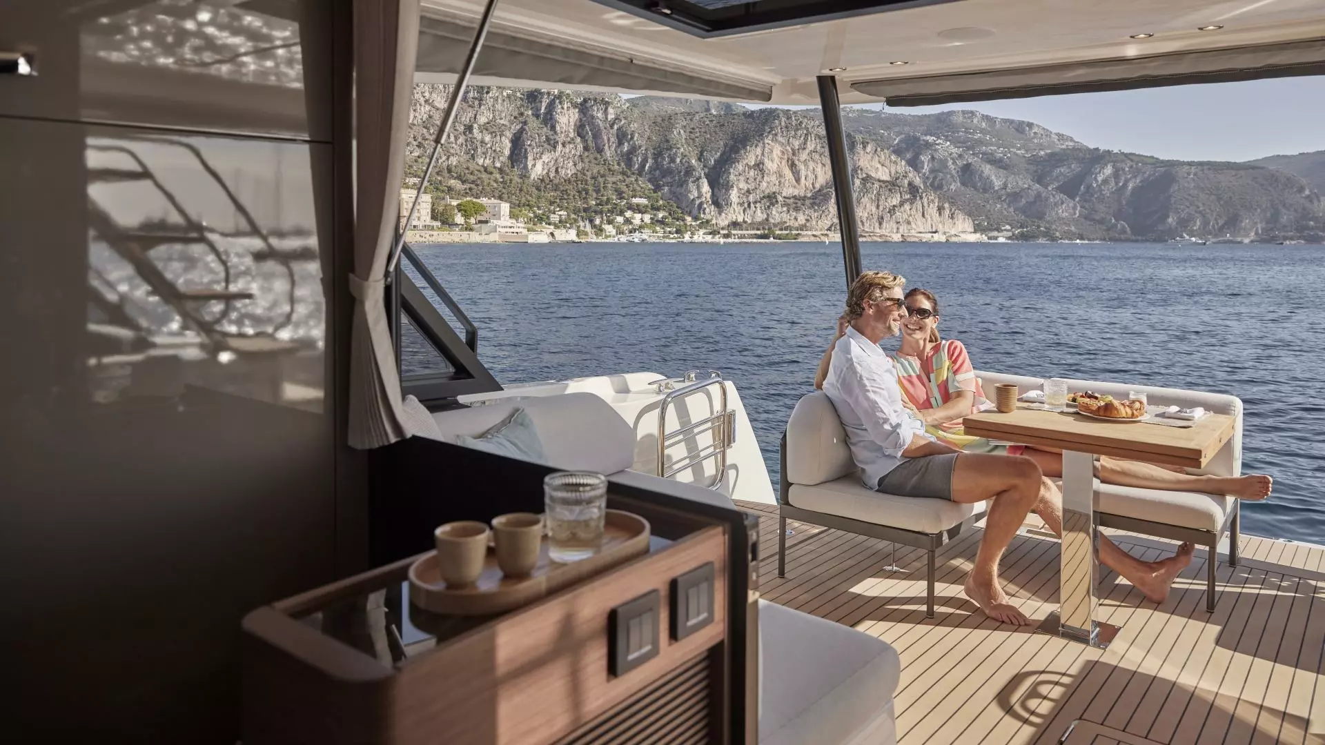On the flybridge, an outdoor bar with a grill and coolers awaits port, and a large dining table served by a sofa starboard, everything protected by a high hard top with slim side supports that minimally obstruct the view.