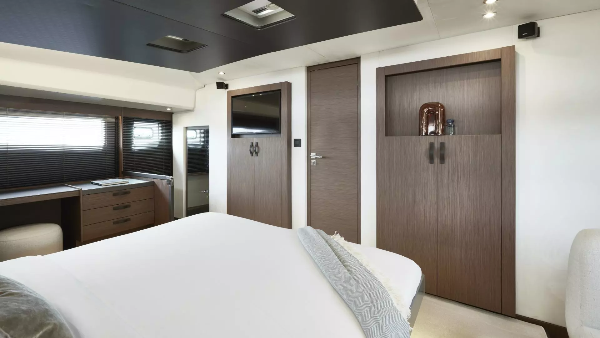 The Prestige M48 has three guest cabins. The master, placed between the two bows, is served by a private central entrance next to the command console, and has a spacious double bed with a headboard facing the bow, a sofa that can be converted into an additional bed, and a desk.