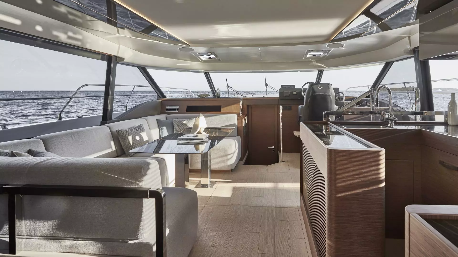 The large sliding doors to the salon open to the left, revealing the galley on the right, surrounded by a low bar, which allows for functionality and separates food preparation from the salon. On the left side of the salon, there are the stairs leading below deck, and a dining table served by a sofa. Large glazing and a three-panel windshield allow panoramic view of the sea from the salon.